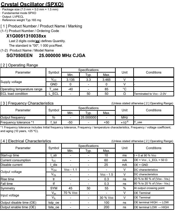 | X1G005131003800 | SG7050EEN | 25.000000 MHz | 7.00 x 5.00 x 1.70 mm | LV-PECL | 3.135 to 3.465 V | -40 to 85 °C |