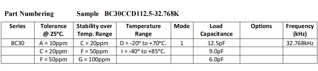 8038四脚贴片晶振,BC30CCD112.5-32.768K,Bomar实时时钟6G晶振 参数表