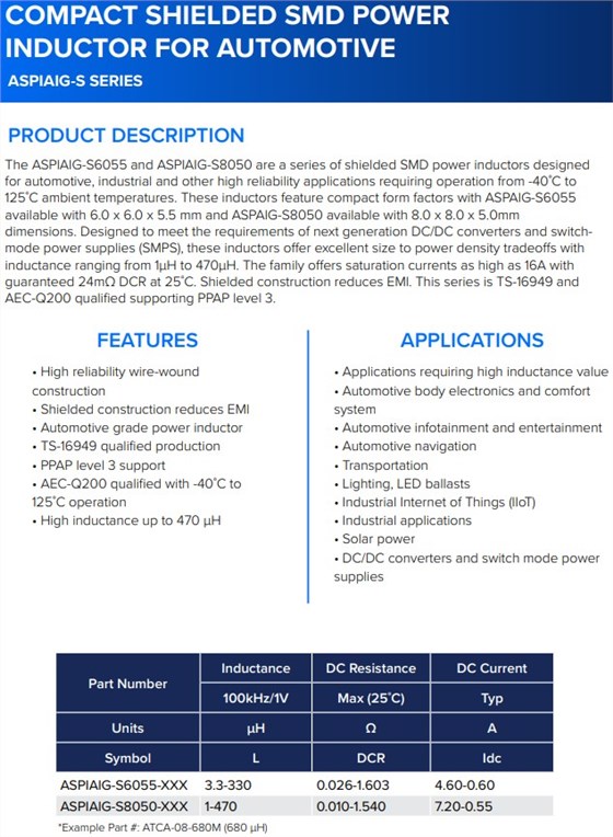 特征:高可靠性线绕,建筑,屏蔽结构降低了电磁干扰,汽车级功率电感,耐高温晶振,TS-16949合格产品,PPAP级支持,AEC-Q200符合-40℃的要求,125℃操作,高达470 μH的高电感