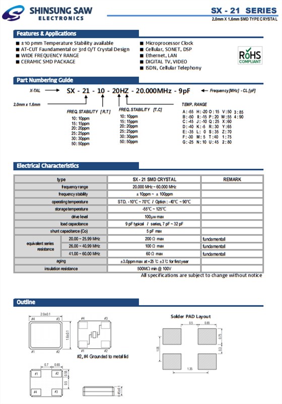 | SX-21-10-20HZ-20.000MHz-9pF | Shinsung晶振 | 20 MHZ | 10ppm | 20ppm | 9pF | -20℃至+70℃ | 2.0 x 1.6mm |