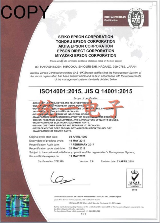 爱普生一直以来所追求的都是了解客户所需,凭借自身优势所在为客户提供极致化产品和服务,使客户在选择时首先有安心感,其次就是对产品品质的保证.领先的技术实力始终是爱普生晶振集团发展的关键词"省,小,精"是爱普生自创立以来就拥有的核心技术.爱普生晶振集团建立可行的技术及经济性环境目标,并确保其环境保护活动的质量.爱普生晶振集团公司将关注所有环境适用的法律、法规和协议的遵守情况.另外为更有效的进行环境保护,将建立自己的特有的环境标准.以下是宫崎爱普生晶振公司ISO14001证书.