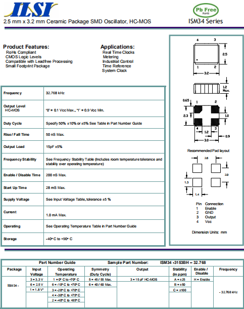 ILSI晶振,耐高温晶振,ISM34低电压振荡器.有源晶振,是只晶体本身起振需要外部电压供应,起振后可直接驱动CMOS 集成电路,产品本身已实现与薄型IC(TSSOP封装,TVSOP封装)同样的1mm厚度,断开时的消费电流是15 µA以下,编带包装方式可对应自动搭载及IR回流焊接(无铅对应)产品有几种电压供选1.8V,2.5V,3V3.3V,5V,以应对不同IC产品需要.