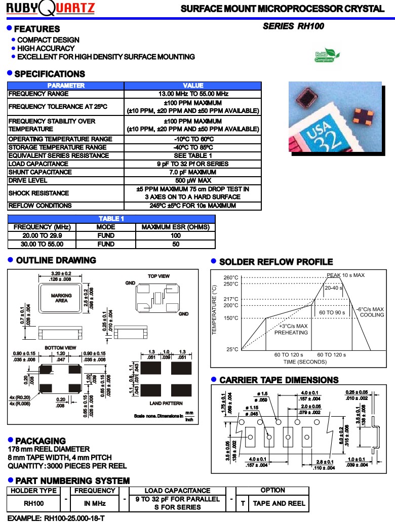 RH100-25000-18-T,3225mm,RH100,25MHz,Rubyquartz轻薄型晶振,Rubyquartz晶振,美国进口晶振,卢柏晶振,型号:RH100,编码为:RH100-25000-18-T,,频率为:25.000MHz,负载:18pF,工作温度范围:-10℃至+60℃,小体积晶振尺寸:3.2x2.5mm封装,四脚贴片晶振,无源晶振,SMD晶振,石英晶体谐振器,3225晶振,石英晶振,超小型晶振,轻薄型晶振。应用于:通讯设备晶振,无线蓝牙晶振,汽车电子晶振,平板电脑,导航仪晶振,智能家居晶振,数码电子等应用。